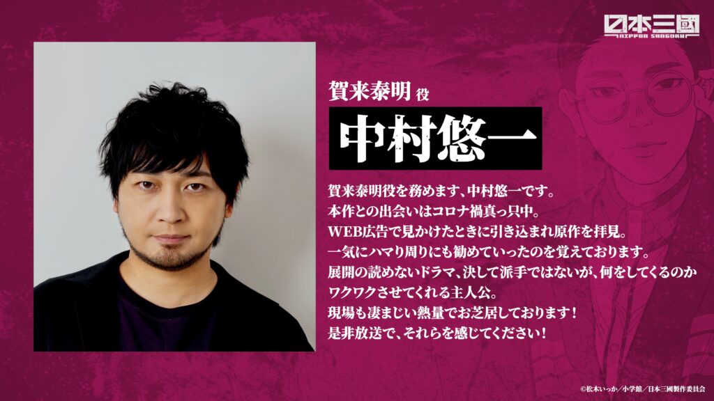 賀来泰明役を務めます、中村悠一です。
